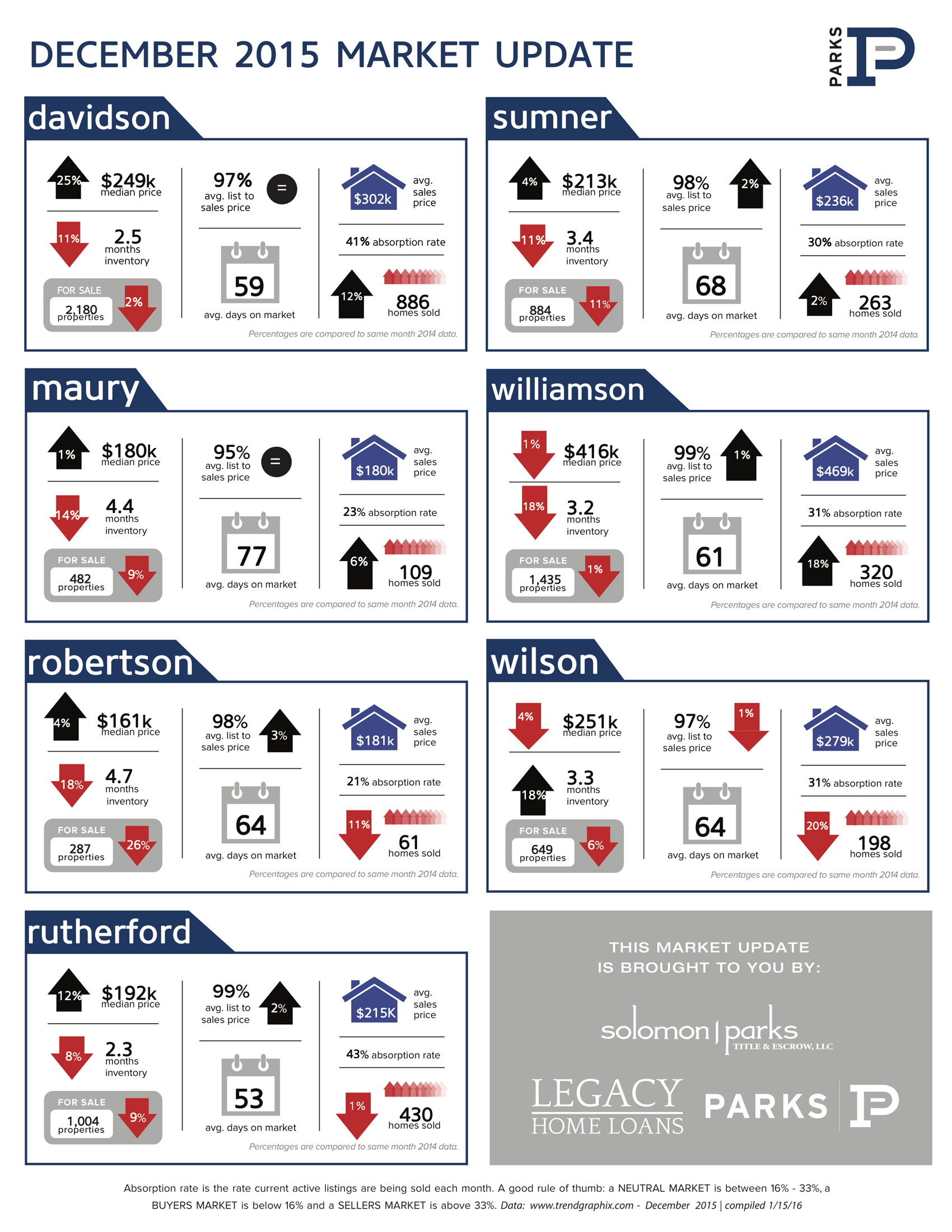 Below is the December 2015 Real Estate update for the Nashville market and surrounding counties. Note that in Davidson County, the median price of a home ROSE 25% over December 2014. That’s over 2% ($5,000) per month on average, based on the median price home. Now the increase is not as dramatic on other areas, and in fact DROPPED in Wilson and Williamson counties, but what happens in Nashville very quickly migrates out.